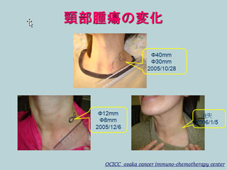 平成16年6月より平成23年4月の間に1291例の癌の進行再発患者に温熱・免疫療法を施行しています。この内176例の有効(半分以上縮小または、6ヶ月以上不変)。32例に全再発病変の完治を認めています。 大腸がん多発転移の45歳女性の例を挙げます。温熱治療と未熟樹状細胞の腫瘤内局注と活性化リンパ球により、頸部および腹腔内再発が完全奏効(すべての病変が消失)した症例です。従来の免疫細胞療法単独に比べ、温熱療法を併用することにより抗腫瘍効果が著しく増強されました。温熱療法により、がん組織の腫瘍抗原提示能の増強と免疫担当細胞の増加および活性の上昇が、免疫細胞療法の効果を増強したものと思われます。樹状細胞は頸部しか投与していませんが、頸部だけでなく腹腔内の転移もすべて消失しました。再発がんの多くでは完治したといっても、がんがどこかに潜んでいて、またいつか出てくることがあります。それを防ぐためにも副作用の少ない治療は重要です。 ●2003年11月、海外で下行結腸がんに対し、左結腸切除術を受け、moderately differentiated adenocarcinoma, n+ 22/30。 IVHポートを介した術後化学療法を施行した。 ●2005年9月、左鎖骨上リンパ節転移、径30mm。腹腔内大動脈周囲リンパ節多数腫大を認め、免疫治療を希望して来日。 ●2005年10月末受診。左鎖骨上に径40mmと30mmの腫瘤を認めた。 ●同年11月より温熱治療を週1回、当初は頸部、後半は腹部に計11回施行。 ●未熟樹状細胞の鎖骨上転移リンパ節への局注を2回、活性化リンパ球の点滴投与を7回施行した。 ●TS-1、1日80mgを4日間投与しては、免疫療法をはさんで3日間休薬することを繰り返した。2006年1月初めには鎖骨上腫瘤は消失し、CTでも頸部、腹部いずれのリンパ節の腫脹も認められなかった。 ●CEAは2005年10月16.7ng/mlが、2006年1月1.1ng/mlと正常値に低下。またIAPは、2005年10月1,118μg/mlが、2006年1月228μg/mlと正常値に低下した。 ●1月末、帰国された。 ●同年4月に再来日し、CTおよび全身PET施行するも、頸部、腹腔内ともに腫瘤の再発を認めなかった。