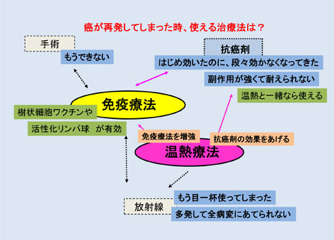 ◆免疫療法の一つである「免疫賦活療法」に用いられているのは、厚生労働省が認可したものからサプリメント、健康食品まで幅広く、効果や安全性を疑問視する医師や使用を認めない医師も少なくありません。これらを上手に利用して治療に役立てるためには ? 古来、キノコ類に抗がん作用があることや、溶連菌感染症である丹毒にかかるとがんが消えることもあるのが分かっていました。これらのキノコや溶連菌の中には免疫を高める免疫賦活物質が含まれており、上手に使えばがんの予防や治療の手段になり得ます。 溶連菌から取り出されたピシバニールという製剤やキノコから抽出されたレンチナン、クレスチンといった製剤はデータもあり、いずれも厚生労働省が認可した医薬品です。これらは免疫賦活療法の中でも一番レベルの高いものであり、当センターではこれらを使った免疫賦活療法も行っています。 サプリメントの中にはいろいろあります。もう少しで薬に匹敵するようなサプリメントもあるし、うわさだけで本当に効くかどうか分からないサプリメント、逆に害があるかもしれないサプリメントもある。注意点は、そのサプリメントに対するデータがどれだけあるか。当センターでは専任の栄養士がデータを集めてランク分けし、患者さんがサプリメントなどを使用したいと言ってこられた時に対応しています。 人間に使用してどれだけ効いたかというデータがあるのがAランク、動物実験で効いたというデータがあるのがBランク。成分表があるのがCランク。うわさだけというのがDランク。同じキノコでも、これはどのランクか言ってあげなければ、患者さんは分からないでしょう。 そこで、注意しなければいけないことがあります。サプリメントによって免疫力が仮に10上がるとしても、がんによって免疫力が100ぐらい下がっていると思わなければなりません。たとえ10上げても、それでがんを治すところまではいかない。他の方法、手術、放射線などでがんをやっつけて、マイナス100を0までもっていったところで、サプリメントの10は非常に役に立ちます。それをせずにサプリメントの10だけでは助かりません。 ◆免疫療法を中心に話を伺ってきました。最後に、温熱治療を含む集学的治療のあり方、患者が心掛けておきたいことなどをお願いします。 もちろん、手術できるがんは手術しましょう、一番確実にがん細胞を取ることができるのですから。放射線も今は副作用が少なく治療できますから、それがベストならしてもらいましょう。しかし、手術、放射線、抗がん剤だけでは完治したつもりでも再発することがあります。がん細胞が少なく弱ったときに、残ったがん細胞に免疫でとどめを刺すことで完治の可能性が高まります。 温熱治療に関しては、免疫、抗がん剤、放射線の治療効果を増強する大事な働きがあります。従来の手術、抗がん剤、放射線の治療は重要ですが、これでがんを完全に制圧できるわけではありません。副作用の少ない免疫療法と温熱療法を併用することにより根治症例も増え、治療効果を確かめることができるようになりました。特に再発時を考えますと、手術も放射線もできない事が多く、抗癌剤も耐性ができたり、副作用が強くなり、減量したり中止する事が多くなります。そうしますと、免疫療法、温熱療法の重要性はさらに重要となってきます。