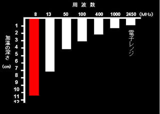 高周波の熱源は、短波・超短波・マイクロ波等を用いることができますが、領域加温技術においては短波を採用しています。それは組織の誘電体損失の差を大きくすること、すなわち高周波の取り込み量(吸収量)を、がん組織において多くし、他の組織に比べ発熱温度を高くするためです。 熱源に用いる高周波(短波)は、より高い周波数の超短波・マイクロ波に比べ、生体内への深達性に優れ、深在性がんの加温に適しています。周波数が高くなるにつれて高周波出力の減衰が顕著となり、深い組織の加温は難しくなります。
