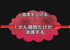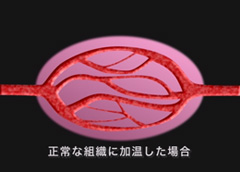 がんは手ごわい相手ですが、無敵ではなく弱点もあります。がん細胞は正常な細胞に比べて熱に弱いことが、世界の研究者によって証明されています。がん組織は血流が少なく、加温しやすいという特徴を持っています。がんの部分だけ温度が上昇し、周りの正常な組織の温度は上がりにくい点に着目し、研究を重ねて生まれた治療法がハイパーサーミア(がんの温熱治療)です。 正常な血管は「拡張・収縮」することによって、身体の温度を調節しています。例えば、熱いお湯の中に手を入れたり、お風呂に入った場合を考えてみましょう。43℃くらいになると、もう皮膚が真っ赤になります。皮膚には網の目のように毛細血管が走っています。熱を感じた血管は拡張することによって血流を増やし、熱を運び去って、それ以上皮膚の温度が上がらないようになっています。 一方、がんの内部に栄養を運ぶ血管は、温度が上がっても拡張して血流を増やすことができません。したがって、がんの部分を加温装置で温めてやると、周囲の正常組織はそのままで、がん組織の温度だけを上昇させ、がん細胞を死に導くことができるわけです。