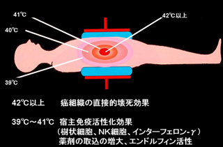 がん組織は熱に弱く、42〜44℃の加温で壊死します。しかし、正常組織は42〜44℃では影響を受けません。「熱による直接的な壊死効果」とともに、がんの周辺組織も39〜41℃に加温されることによって宿主免疫細胞が活性化します。「熱でがんをやっつける」だけでなく、温熱が「免疫力を高めてがんを攻撃する」という面の研究も進んでいます。 放射線や抗がん剤は、正常組織への副作用を考えると使用には限度があります。ところが、ハイパーサーミアにはそのような制約がなく、副作用はほとんどありません。それぞれの患者さんの病態に応じて、ハイパーサーミアは何度でも利用できますし、手術や放射線治療をした後でも行えます。 |